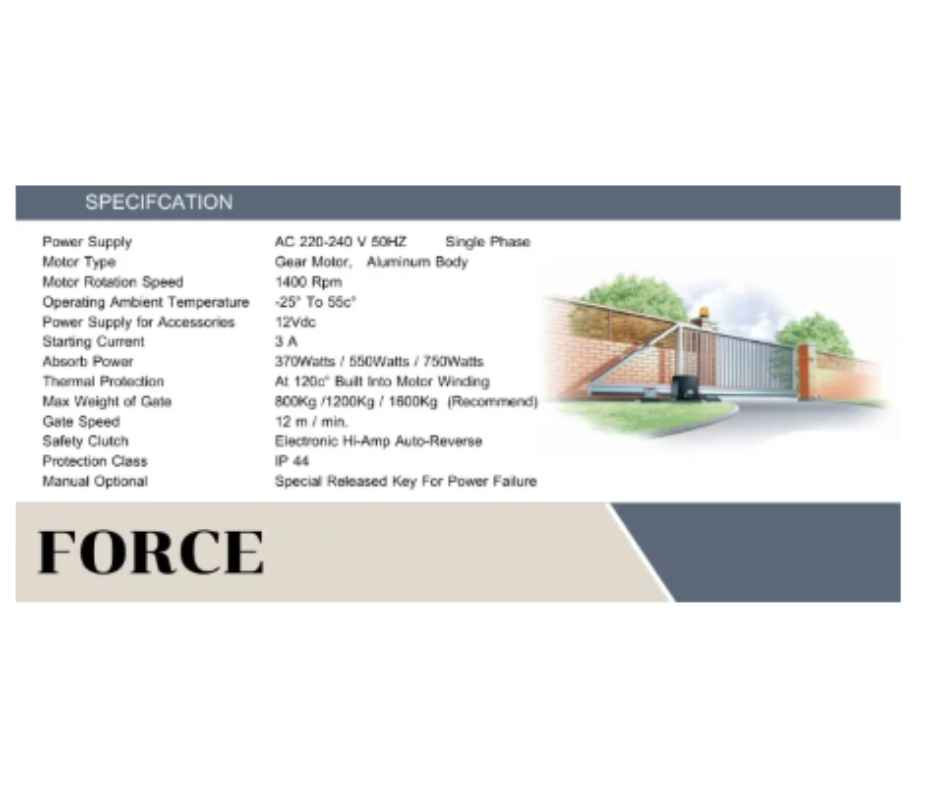 ใช้กับประตูที่มีน้ำหนักไม่เกิน 1000 กิโลกรัม (สามารถใช่กับประตูบ้านทั่วไปได้เป็นอย่างดี) สามารถเพิ่ม Option ได้ ทั้งโฟโต้เซล (เซนเซอร์กันหนีบ) ไฟหัวเสา คีย์การ์ด กุญแจรหัส และอื่นๆ เป็นมอเตอร์ที่ขายดีอันดับต้นๆ ของเมืองไทย มีอะไหล่ครบทุกชิ้น ราคาไม่แพง เหมาะกับเศรษฐกิจยุคประหยัด ชนแล้วไม่ค้าง แข็งแรงทนทาน ใช้งานคุ้มค่า มีกุญแจปลดล็อคกรณีไฟฟ้าดับ (สามารถใช่มือเลื่อนได้ตามปกติ)